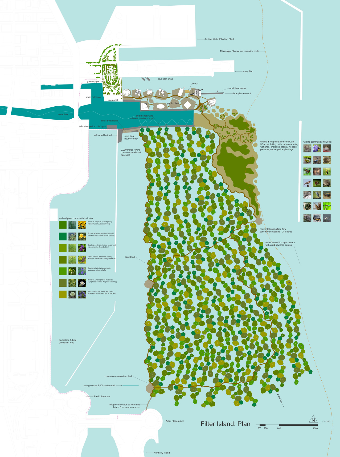 This collaborative studio project proposed re-reversing the Chicago River and building a modular, floating, horizontal sub-surface-flow constructed wetland to clean the river water of sewage and chemicals before it enters Lake Michigan. Each filtering unit in the system consists of 7 connected cells with 2.2 acres of surface area. (131 filter units = 289 total acres of constructed wetland) Water flow through the system is powered by wind turbines connected to pumps, and the water cleansing work is done by plants via phytoremediation and rhizofiltration. Microbes that live in the root systems of the plants continue to clean water after the plants have gone dormant, and at the end of the cleansing process, the water is ready to enter the lake.