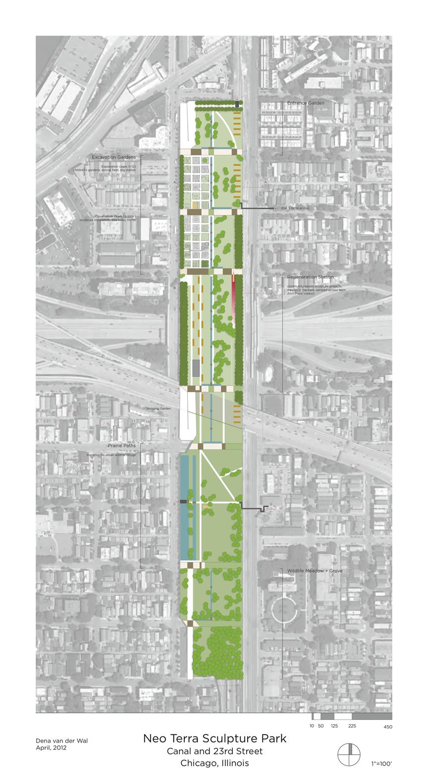 The process of revealing/recreating communities of diverse life under Chicago’s paved surfaces and layers of infrastructure is an exercise in urban archaeology—one that can honor the past use and history of a site while opening up its full potential. The elevated strip of land between Canal and Stewart, 23rd & 29th streets is now in use as a Union Pacific rail transfer station, but contains a world of possibility beneath the surface. Neo Terra (“new land/surface”) Sculpture Park aims to return the elevated land to the entire community, including wildlife. Through a series of cuts into the surface and openings in the walls, material mysteries buried by years of industrial use will be revealed.